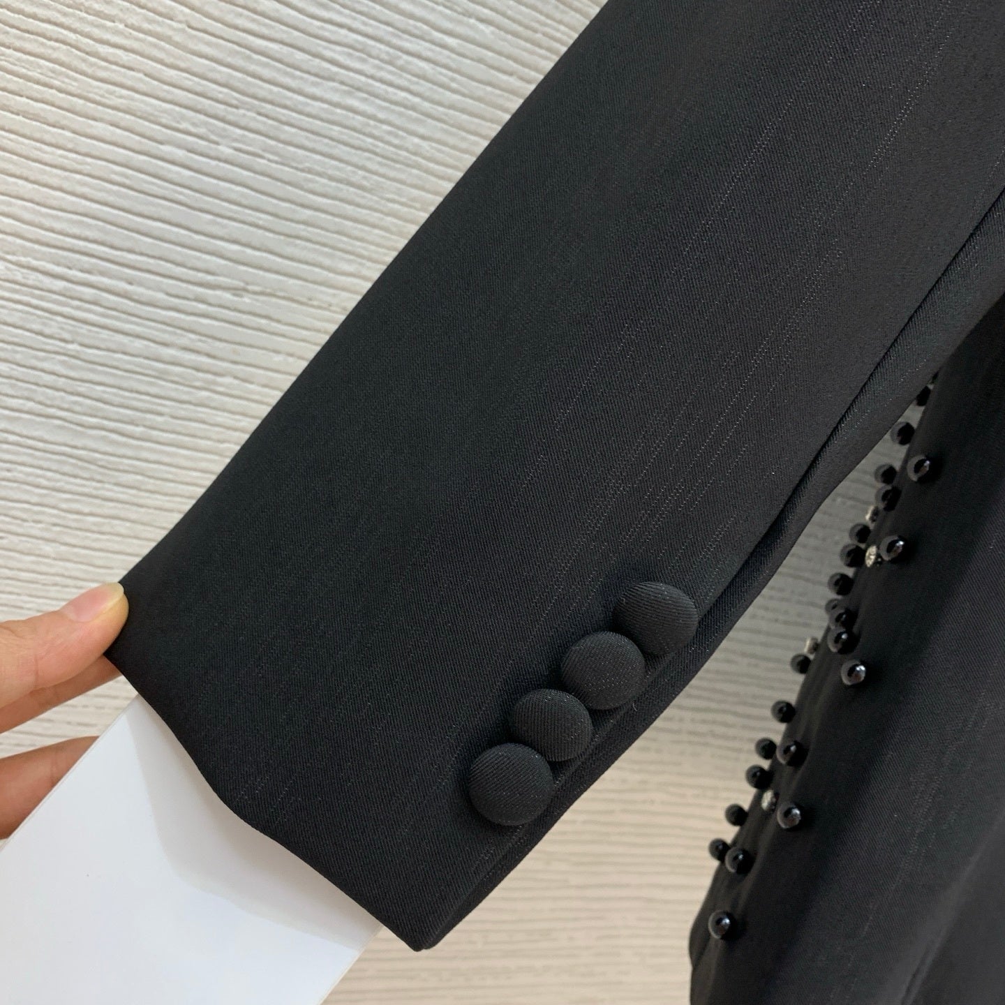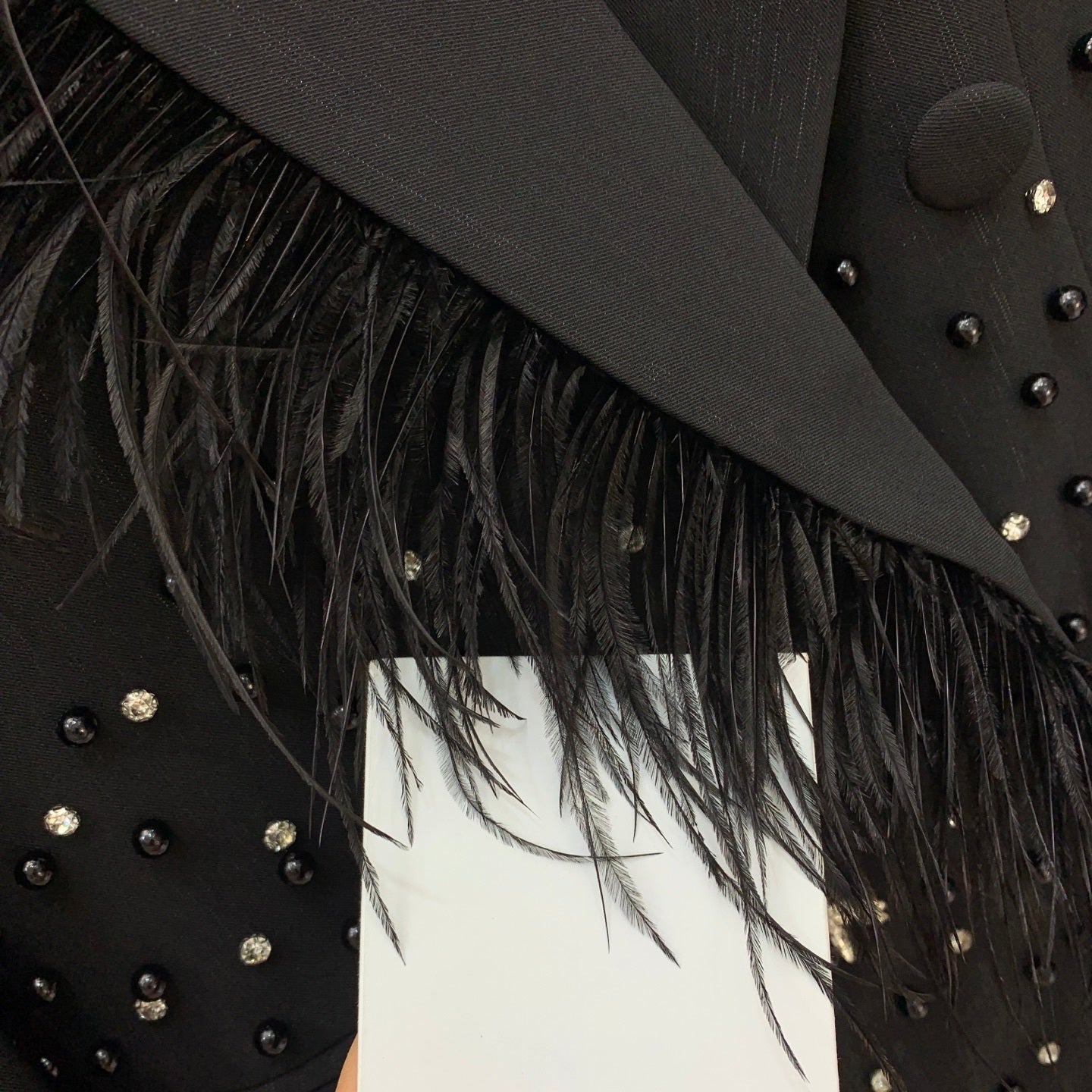 Turn heads with the McQueen (MCQ) high-end custom suit jacket, featuring super heavy-duty ostrich feather trim and intricate beaded and rhinestone bee embellishments. Designed with a double-breasted front, four-button flap pockets, and a loose, stylish silhouette, this jacket exudes luxury and statement-making elegance. Perfect for upscale events or fashion-forward styling.