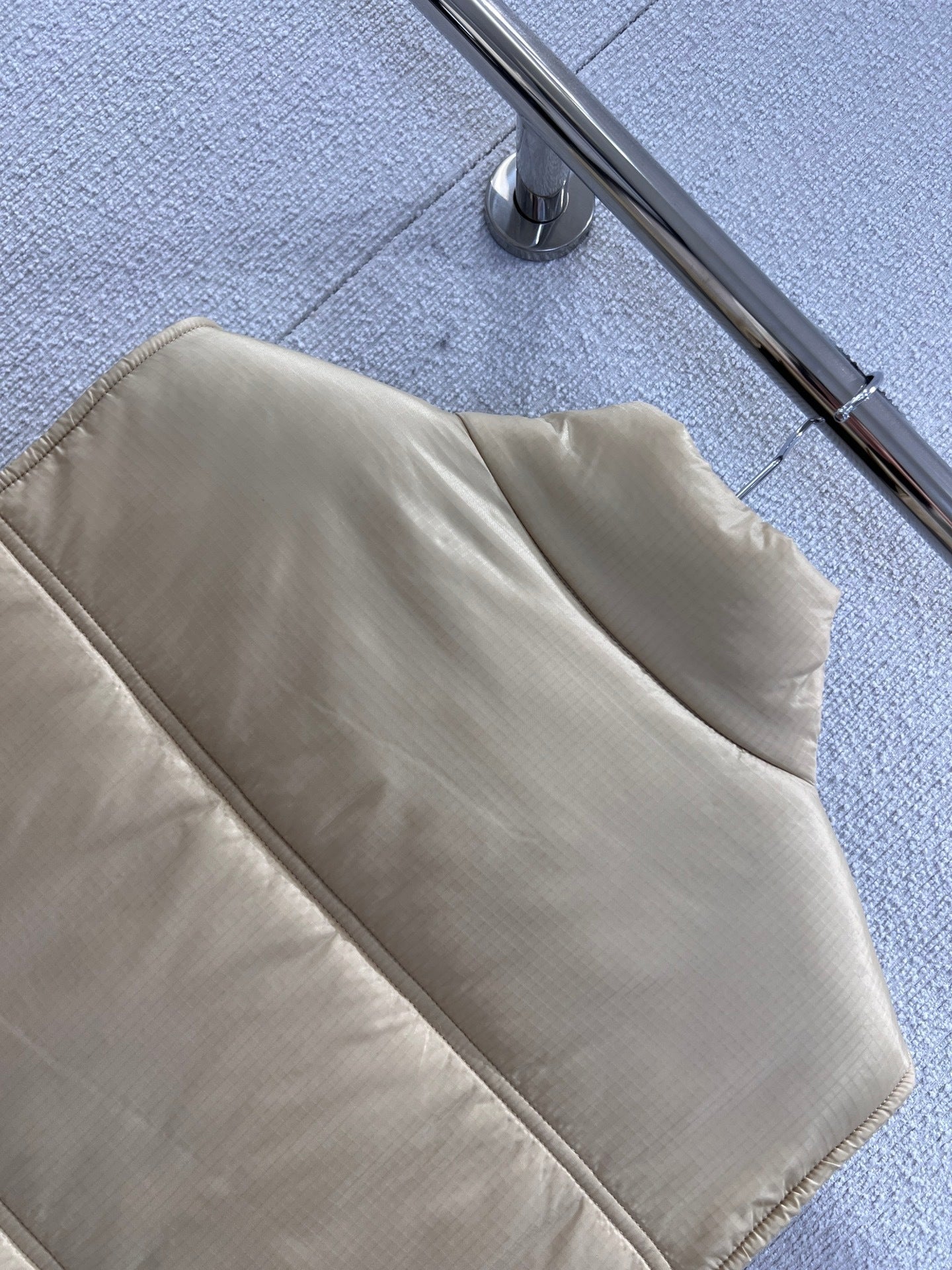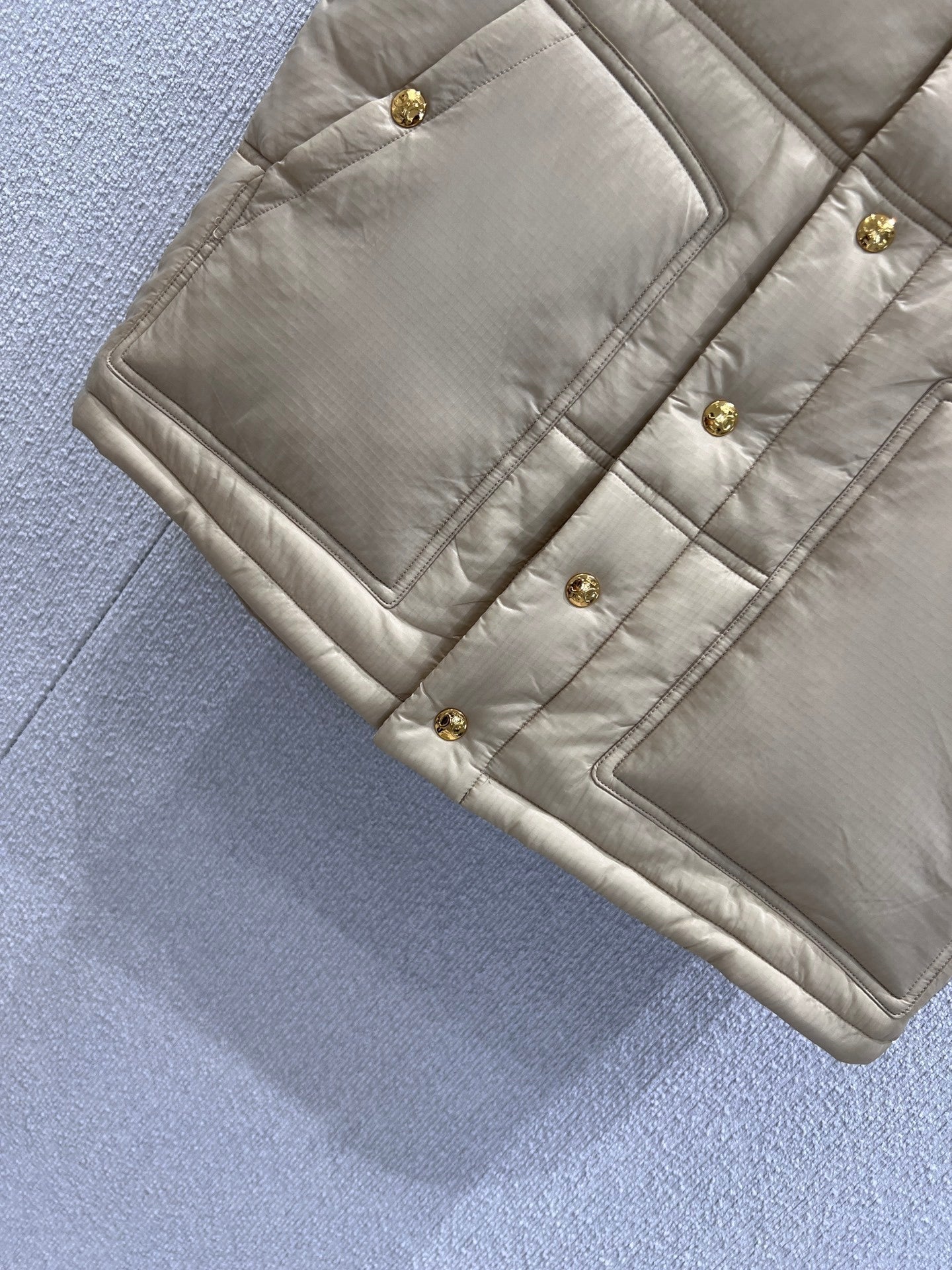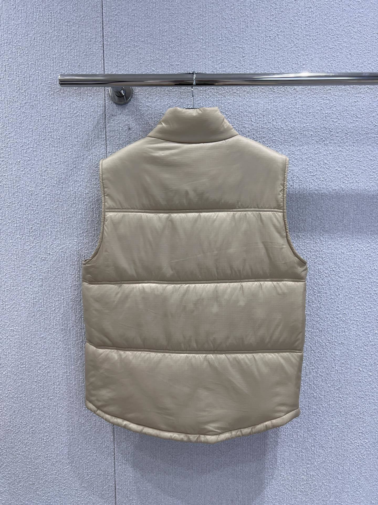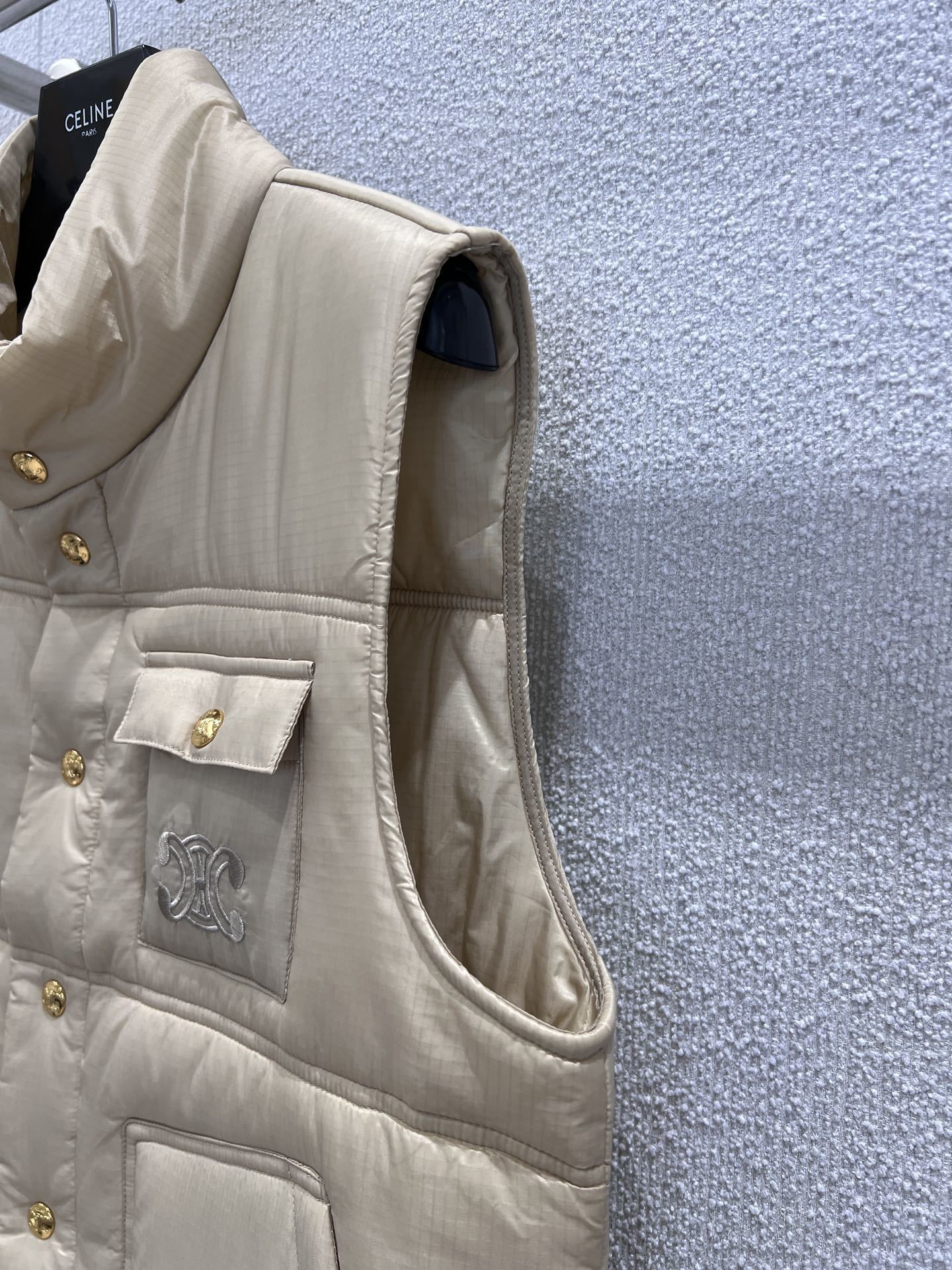Upgrade your layering game with the Celin 25FW Autumn/Winter Triumphal Arch Cotton Vest*, crafted with exclusive high-quality production. Made from matte, slightly wrinkled nylon with a subtle sheen and lightweight, warm cotton filling, this vest offers both comfort and sophistication. Features delicate checkered quilting, a short adjustable stand collar for versatile layering, and all-over metal snap buttons with a vintage golden luster, combining luxury with casual style.