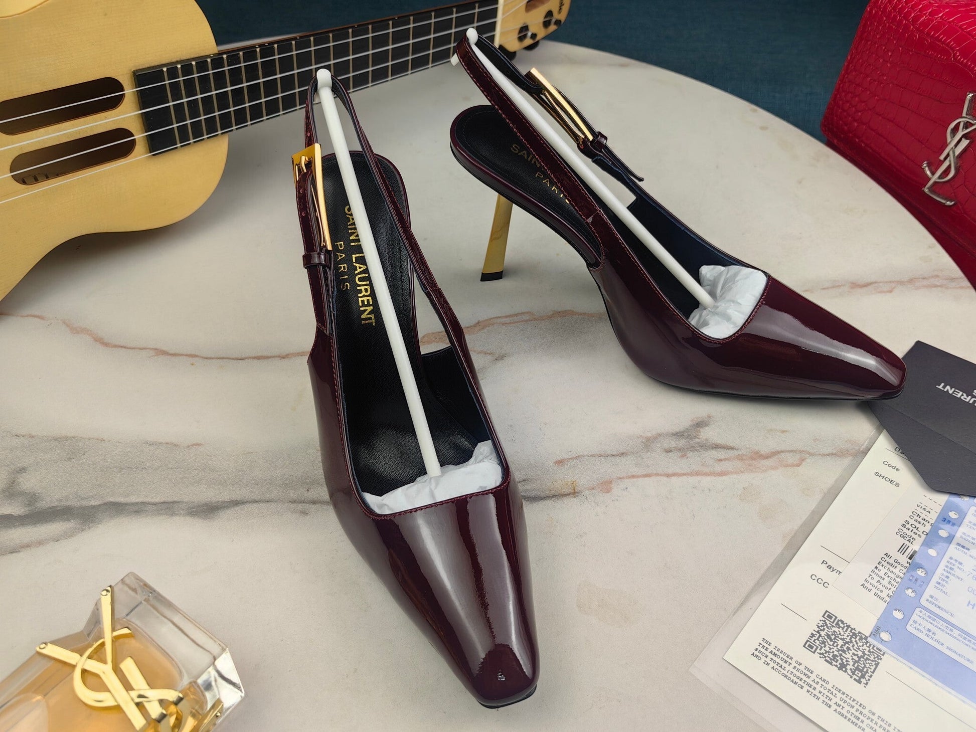 • Color Options: Classic black and dark wine red patent leather.
